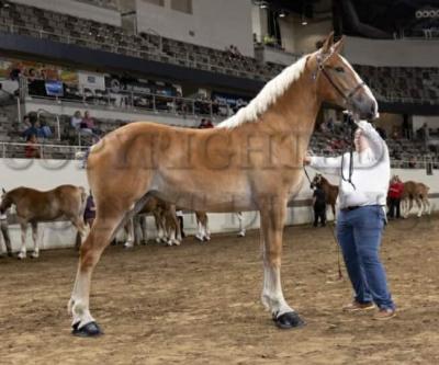 Modern front end yearling, white stripe, mane & tail with 4 white socks. She is show ring proven in 2025 at Illinois State Fair, Indiana State Fair/Nat'l Belgian Show & DuQuion State Fair. She has a pleasant barn disposition. Can shoe & trim free standing in cross ties. Clean pasterns & hocks. She is a clean, smooth & fancy filly. | ||||||||||||||||||